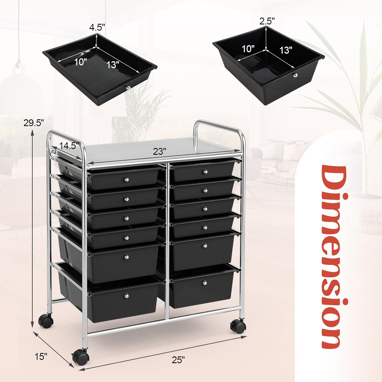 Description:Revamp your storage and organization game with the 12-drawer rolling storage cart.With its 6-layer and 2-column design, this storage cart maximizes space and makes storing and retrieving items a breeze. Whether you need to organize paints, tools, crafts, paper, sewing supplies, pet items, cosmetics, plants, books, or decorations, this cart is designed to meet all your storage needs.Features:- Sturdy top surface and multiple drawers in two different sizes offer generous storage space- Easily customizable with removable drawers- Silent, smooth-rolling wheels- Round knobs for easy gripping and sliding drawers- Rust-resistant finish on metal frame ensures longevity- 360-degree swivel casters for easy maneuverability- Two lockable casters for stability and secure positioningSpecification:Material: Metal +PPOverall Dimensions: 25" x 15" x 29.5" (L x W x H)Dimensions of Top: 23" x 14.5" (L x W)Dimensions of Small Drawer: 13" x 10" x 2.5"(L x W x H)Dimensions of Large Drawer: 13" x 10" x 4.5" (L x W x H)Net Weight: 13 lbsPackage Includes:1 x 12-Drawer Cart1 x Instruction