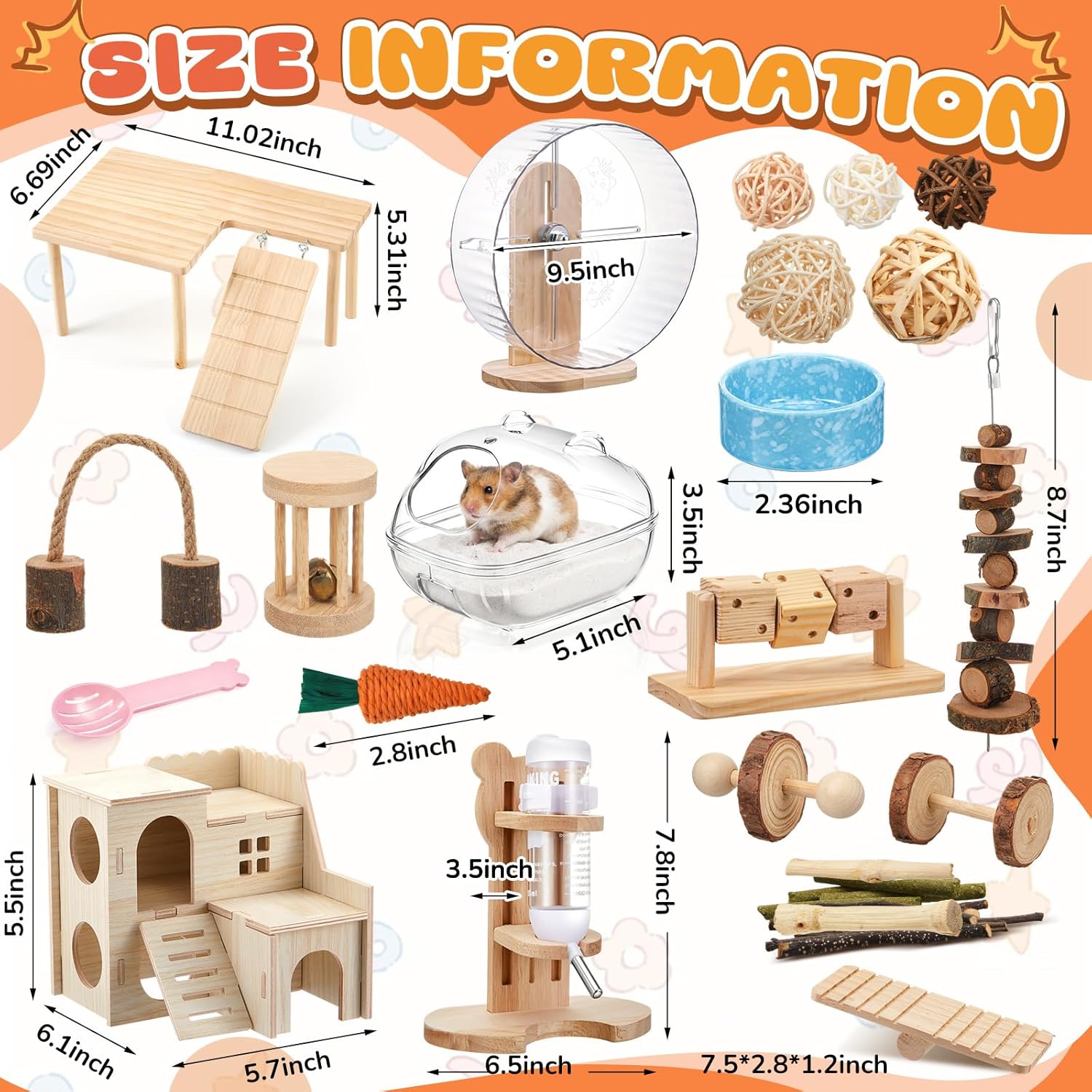 Features: Crafted for Small Critters: Specially crafted for hamsters, gerbils, and birds, these hamster cage accessories provide engaging activities and prevents boredom. It is ideal when you are away, keeping your pet occupied, enriched, and content in its habitat. Complete Grooming and Bathing Setup: The sand bath is about 5.1 x 3.5 x 3.5 inches allows dust or sand bathing behaviors. The functional hamster stuff supports natural grooming instincts while adding decorative appeal to the habitat. Specifications: Material: mainly wood Color: natural Size: Silent exercise wheels: about 9.5 inches in inner diameter Hamster water bottle holder: about 7.8 inches high and 6.5 inches wide, with a water bottle capacity of 4.2 ounces Food bowl: about 2.36 inches in diameter Sand bathtub: about 5.1 x 3.5 x 3.5 inches Package includes: 1 x Silent hamster wheel 1 x Hamster water bottle with holder 1 x Maze wood house 1 x Hamster platform 1 x Food bowl 1 x Sand bath with 1 shovel 18 x Small animal chewing toys Notes: Manual measurement, please allow slight errors on size. The color may exist a slight difference due to different screen displays. Before purchase, confirm whether the product size is suitable for your pet, and observe the pet's reaction when using