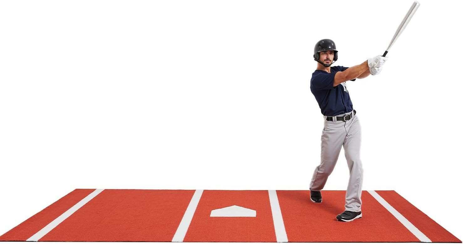 Material: PolypropyleneColor: White+RedDimensions: 12 ft x 6 ftWeight: 50 lbsPackage Includes: 1 matMounting Type: Floor-standingNotes: Non-slip rubber backing, 15mm PE grass fibersThis 12 ft x 6 ft baseball batting mat features a non-slip rubber bottom for stability during practice. The polypropylene construction with 15mm PE grass fibers creates a realistic turf for batting, pitching, and catching drills. White striping and home plate markings help maintain proper stance alignment. Designed for indoor and outdoor use, the mat's weather-resistant material ensures durability through repeated use. Ideal for batters, pitchers, and catchers, this portable mat offers a versatile training solution with easy storage and