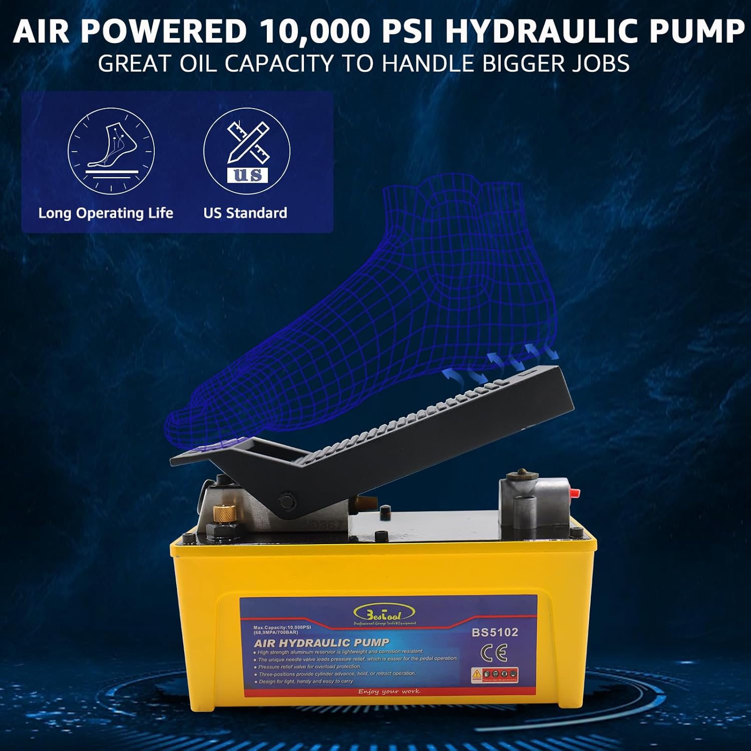 | Model Name | BESTOOL Air Hydraulic Pump, 10,000 PSI 1/2 Gal Reservoir, NPT 3/8" Oil Outlet, 2 x 6.5 ft Pipe, Foot Actuated Hydraulic Pump Air Treadle for Auto Body Frame Machines and Pulling Post, Yellow |