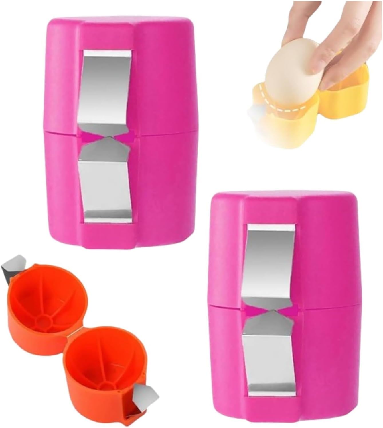 Features:Perfectly cracks eggs-no fragments left. Compact and easy to store-compact, lightweight, and durable.Specifications: Name: Egg Opener Material: Stainless Steel + ABS Color: Yellow, Pink, Orange Weight: 35g Dimensions: 2 x 2 x 3 inches Packaging: 1/2/3 pcs * Egg Opener Tool