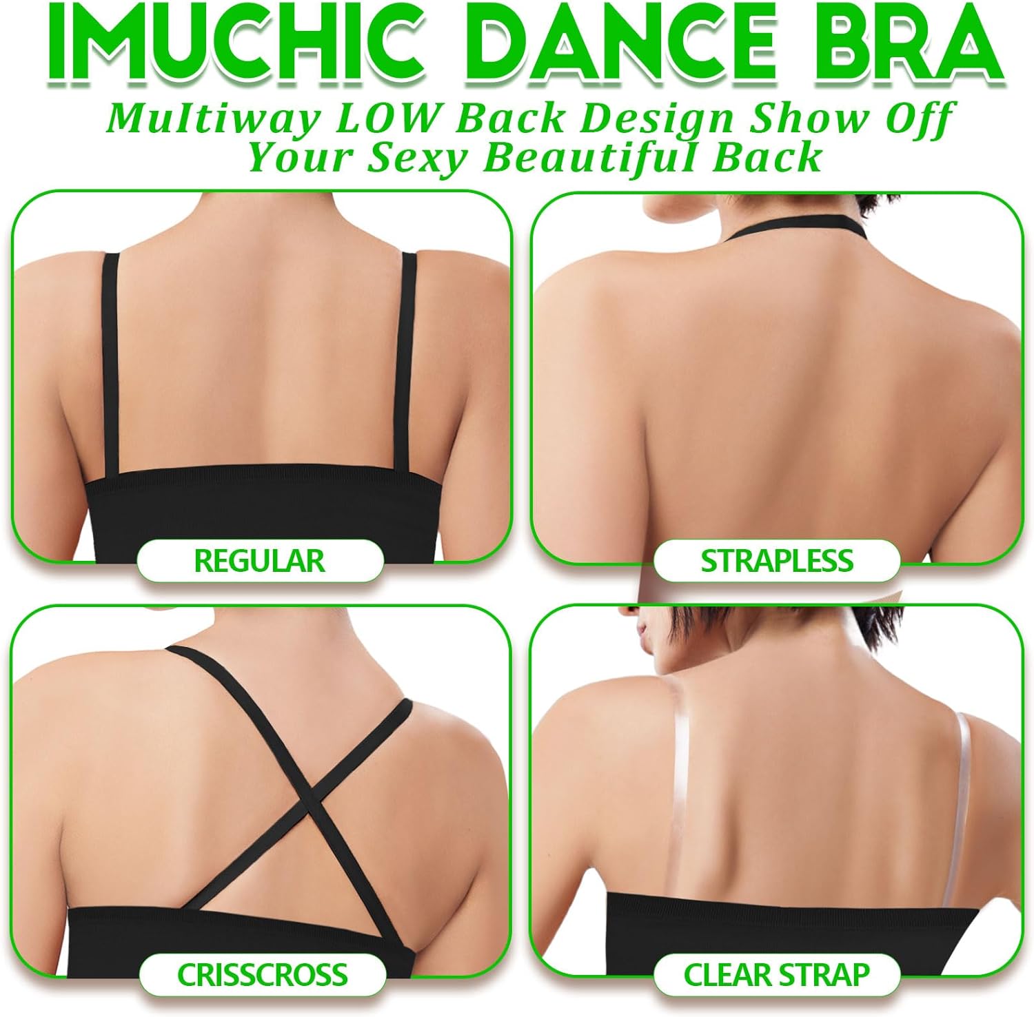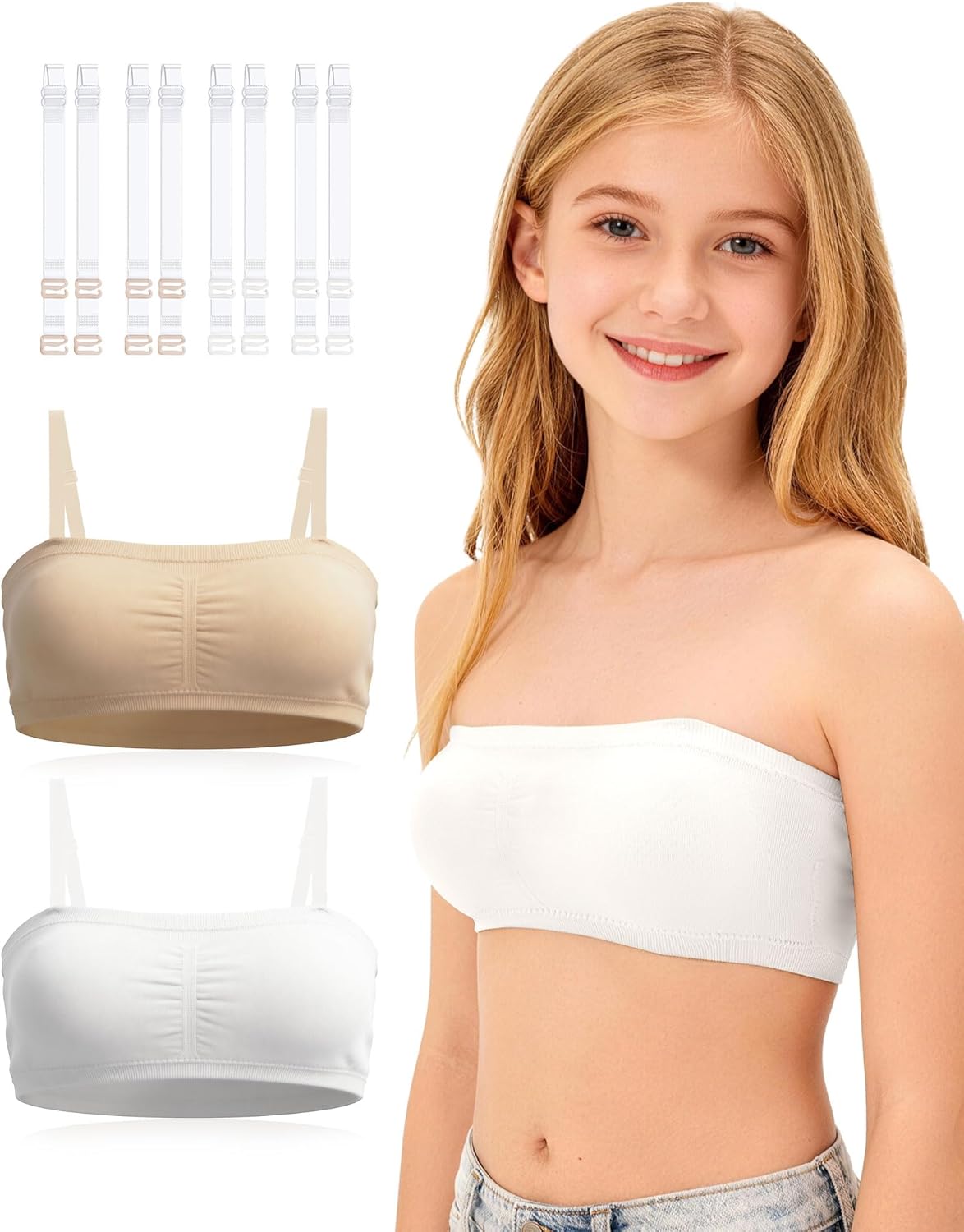 ------------------------Weclome to iMuchic------------------------ Combination fabric of 92% Nylon, 8% Spandex iMuchic Bandeau Bra bras Package Included 1 bandeau bra 1 pair solid color strap 2 pairs thickened adjustable shoulder straps iMuchic Clear Straps Bras for girls dance ballet gymnastics