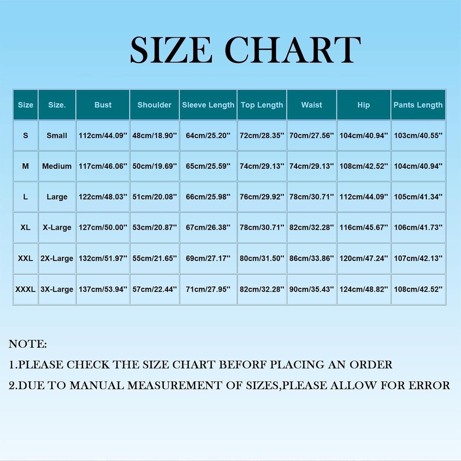 Size.: Small Bust: 112cm/44.09'' Shoulder: 48cm/18.90'' Sleeve Length: 64cm/25.20'' Top Length: 72cm/28.35'' Waist: 70cm/27.56'' Hip: 104cm/40.94'' Pants Length: 103cm/40.55'' Size.: Medium Bust: 117cm/46.06'' Shoulder: 50cm/19.69'' Sleeve Length: 65cm/25.59'' Top Length: 74cm/29.13'' Waist: 74cm/29.13'' Hip: 108cm/42.52'' Pants Length: 104cm/40.94'' Size.: Large Bust: 122cm/48.03'' Shoulder: 51cm/20.08'' Sleeve Length: 66cm/25.98'' Top Length: 76cm/29.92'' Waist: 78cm/30.71'' Hip: 112cm/44.09'' Pants Length: 105cm/41.34'' Size.: X-Large Bust: 127cm/50.00'' Shoulder: 53cm/20.87'' Sleeve Length: 67cm/26.38'' Top Length: 78cm/30.71'' Waist: 82cm/32.28'' Hip: 116cm/45.67'' Pants Length: 106cm/41.73'' Size.: 2X-Large Bust: 132cm/51.97'' Shoulder: 55cm/21.65'' Sleeve Length: 69cm/27.17'' Top Length: 80cm/31.50'' Waist: 86cm/33.86'' Hip: 120cm/47.24'' Pants Length: 107cm/42.13'' Size.: 3X-Large Bust: 137cm/53.94'' Shoulder: 57cm/22.44'' Sleeve Length: 71cm/27.95'' Top Length: 82cm/32.28'' Waist: 90cm/35.43'' Hip: 124cm/48.82'' Pants Length: 108cm/42.52''