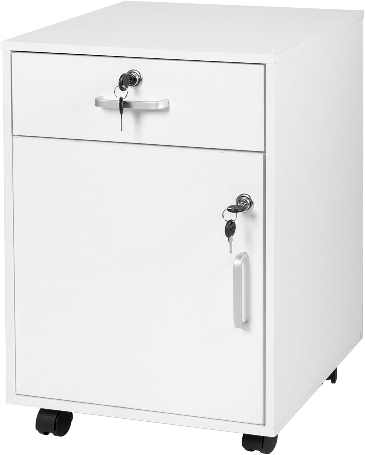 This office cabinet offers plenty of storage space in the drawer and large door compartment to store important files and other office accessories structured and within easy reach. The lockable design keeps confidential documents safe in the desk trolley. With the 4 wheels, the desk cabinet can be easily moved, while the 2 brakes ensure a firm stand. Thanks to its optimal height, the roller cabinet can be pushed under the desk to save space. Rolling container in detail: dimensions H x W x D: approx. 57 x 40 x 40 cm. Load capacity upper shelf: approx. 10 kg. Load capacity drawer: approx. 5 kg. Load capacity door compartment: approx. 10 kg. Material: wood-based material, MDF, plastic, steel. Lockable filing cabinet with wheels. For a sorted workplace in the office or study. Drawer and door compartment offer plenty of storage space for office utensils. Lockable for secure storage of confidential files. Office chest of drawers can be slid under the desk to save space. Top shelf also offers space for printers or coffee machines. With 4 360°. The rotating rotating wheels for the easy Move - 2 wheels with parking brake ensure a secure stand. Durable office container made of robust wood material. Box contents: 1 x desk cabinet in individual parts, 4 x keys, instructions and mounting material, decorative items are not included in the box contents