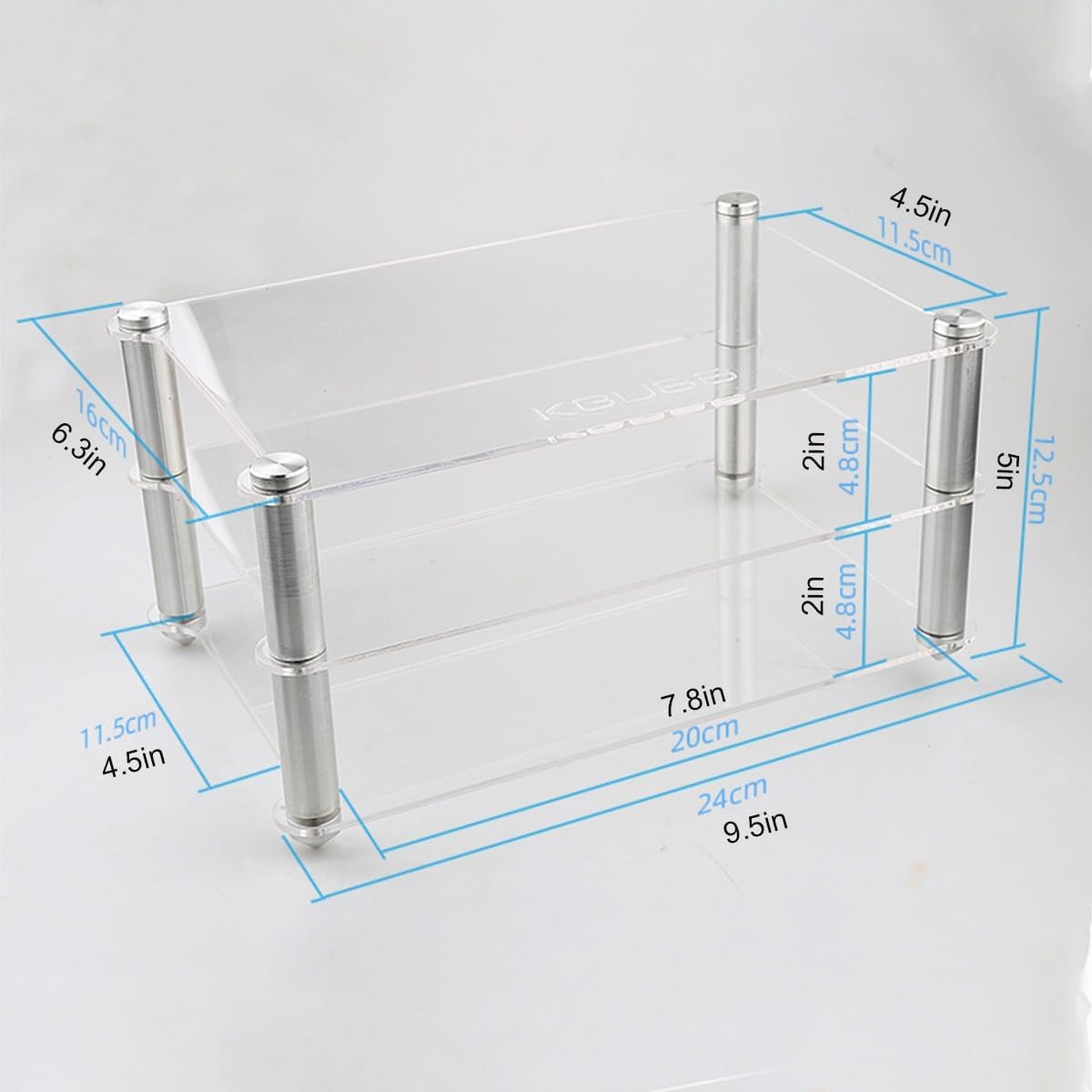 Color: transparent- Style: Simple Modern- Material: Acrylic/Aluminum Alloy- Furniture Structure: Frame Structure- Storage Space:2ierSize:2 Tier--24*11.5*12.5cm/9.5*4.5*5in(Pay attention to product size)Assembled or Not: YesApplicable Scenarios: Home/Office/Store/Theater, etc.Package Included:1 x AV Cabinet (Items Shown on the Picture Are Not Included)Note:1. Only storage racks are sold, other products are shooting props.2. Due to the influence of the monitor and light, the actual color of the product may be slightly different from the color