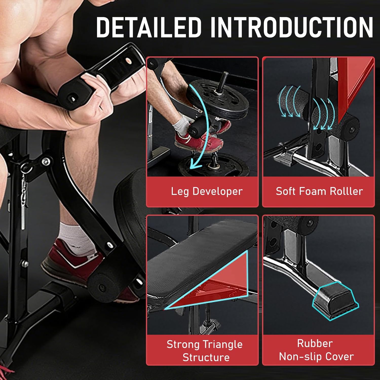 Descriptions:All-in-One: It is the 4 in 1 workout bench equipment. What you get is not only a weight bench, but also a barbell rack, a preacher curl bench, and a leg developer machine. The solid and compact design makes it an all-round bench. Ideal for the beginners and intermediate lifters looking to build strength and improve fitness at home.Excellent Adjustability: This weight bench set offers a comfortable backrest. The barbell rack and pastor's curl pad allow you to perform a variety of exercises using the standard weight bench to fully work your legs, back, chest, abs, shoulders and arm.Solid Structure & Comfortable Padding and Foam: The weight bench is constructed with premium tubular steel and widened feet base, which is built to last and solid enough to load 800 lbs. It features more reliable adjustment and locking mechanism. The adjustable cross bar combined with grooves and locking bolt provides extra support. You can place plates on weight storage posts to increase additional stability. Sewn the cushion a stronger double-stitched seam on the edge to better keep it from fraying. The thick foam roller pads and cushion are firm and soft to deliver maximum comfortable support. With its great adjustability and suitable height, it fits all different types of body shapes.Dual-function Leg Developer: The leg developer can withstand 220 lbs weight capacity. While doing leg extension and lying leg curl, you can get a full range of motion. Effectively exercise your hamstrings, quadriceps and calf muscles. Besides, you can lock the leg developer for abdominal exercise to build core strength.Functional Preacher Curl Pad: With multiple benefits, the preacher curl can bring you that you might not find in conventional bicep curl. It facilitates proper posture and avoids cheating while performing arm workouts. Using the adjustable pad can force you into negative movement, which improves strength and muscles growth more efficiently. When not in use, you can remove the preacher attachment.Item Name: Weight BenchMaterial: MetalBearing: 800 LBSFeatures: Heavy-Duty Construction, Adjustable, Dual-function Leg DeveloperSize Details:L: 170cm/66.93", W: 120cm/47.24", H: 105cm/41.34" (Approx.)Notes:Due to the light and screen setting difference, the item's color may be slightly different from the pictures.Please allow slight dimension difference due to different manual measurement.Package Includes:1 x Weight Bench