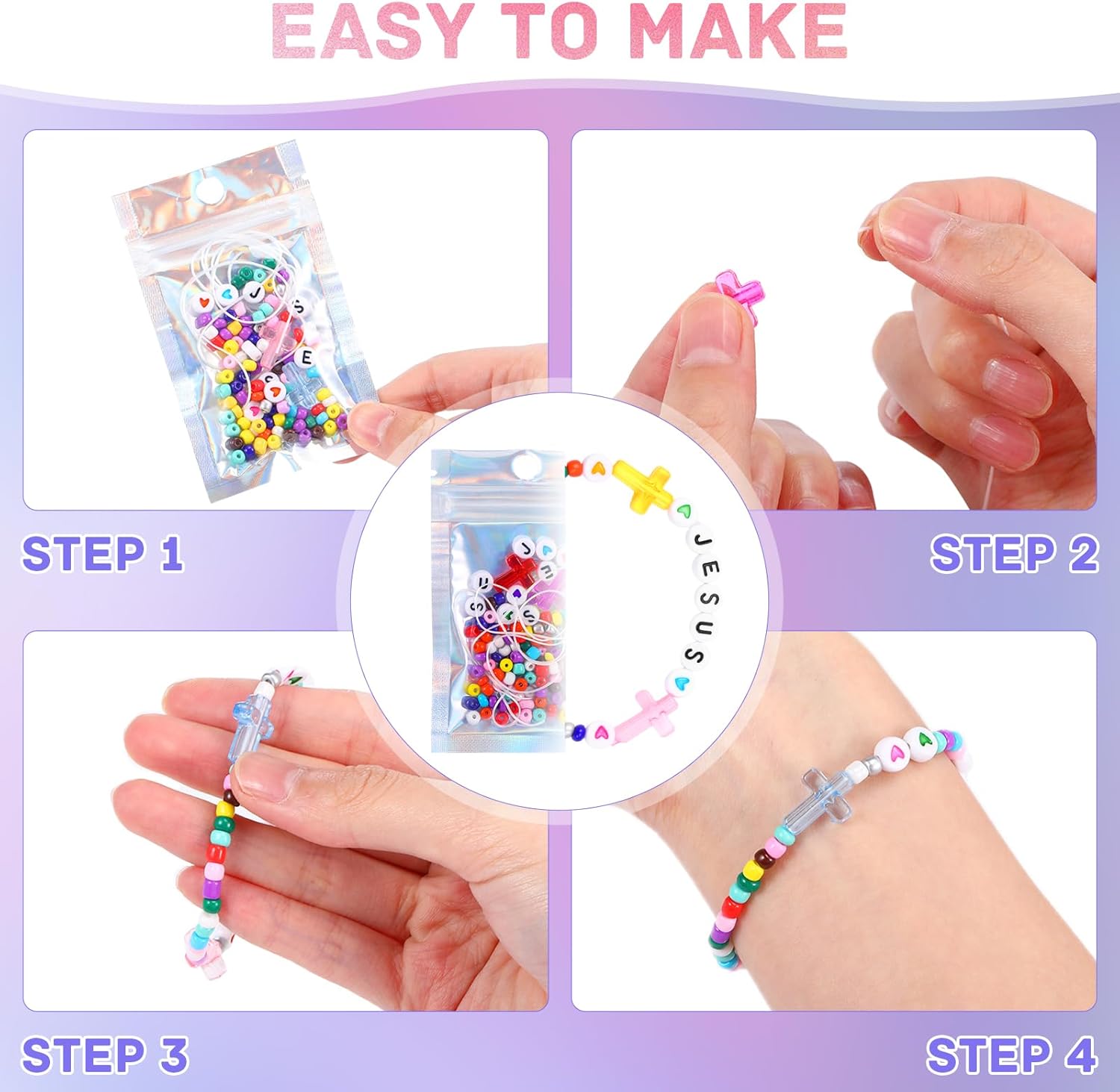 Features: Spiritual inheritance: Carrying a long religious tradition and culture, the wearer connects to the spiritual wisdom of the long river of history through it while integrating it into the individual's current spiritual exploration and practice journey and is a bridge between tradition and the individual. Spiritual comfort: Carrying the blessing or protection meaning of a specific religion, it provides the wearer with a sense of psychological security, a source of strength, and a sense of calmness when facing difficulties, becoming a comfort to the soul. Specifications: Material: plastic Color: colorful Size: (about) Laser silver packaging bag: 3.54 x 4.72 inches/ 9 x 12 cm Package includes: 48 Pack Religious bracelet making kits Notes: Manual measurement, please allow slight errors on size. The color may exist a slight difference due to different screen displays