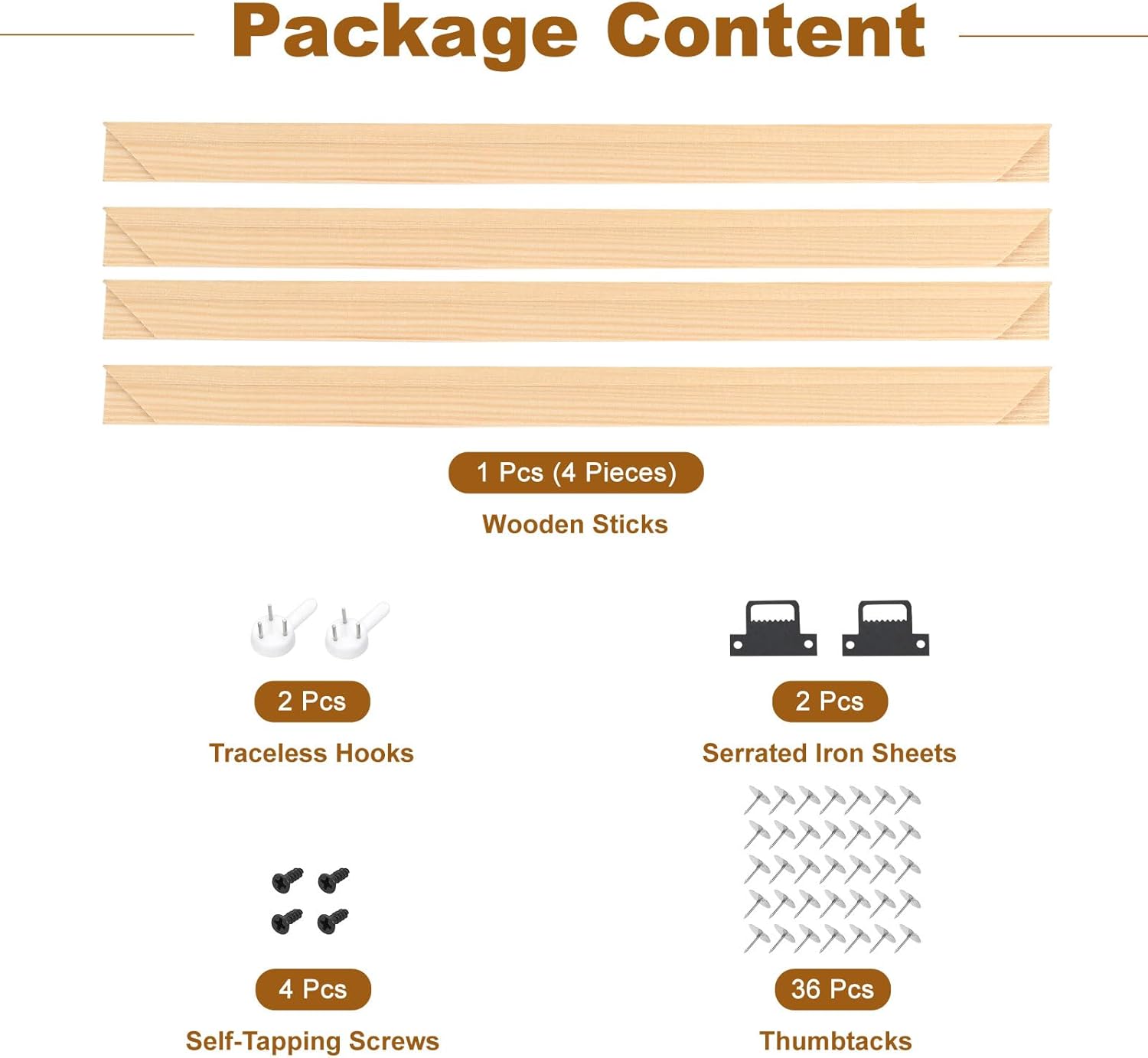 Description:DIY Canvas Stretcher Bars: The assembled dimensions of the DIY canvas stretcher bars is 45 x 45 x 1.5 cm / 17.72 x 17.72 x 0.59 inch(L*W*T), you will receive 2pcs of wooden sticks, 2pcs x Traceless Hooks, 2pcs x Serrated Iron Sheets, 4pcs x Self-Tapping Screws and 36pcs x ThumbtacksWide Application: DIY canvas stretcher bars are widely used, can be applied to oil paintings, posters, HD canvas paintings, etc., suitable for home, office, and gallery wall art accessories, and are great tools for displaying artworkEasy to Use: The wooden picture frame kit is easy to install. The ends of the stretcher bars are designed with slot buckles, the joints are very easy to connect, and you can easily assemble these pine wood bars together quickly to form a lightweight and sturdy canvas frame to display your artworkGood Material: Made of pine wood, the canvas frame strip has a natural beauty, has high strength, can withstand a certain load, is not easy to deform or completely, is sturdy and durable, and can be used for a long timeAdvantage: Our canvas frame allows you to easily hang any artwork as a personalized wall decoration for others to enjoy. You can match it with your favorite DIY work, which is suitable for customized wall art