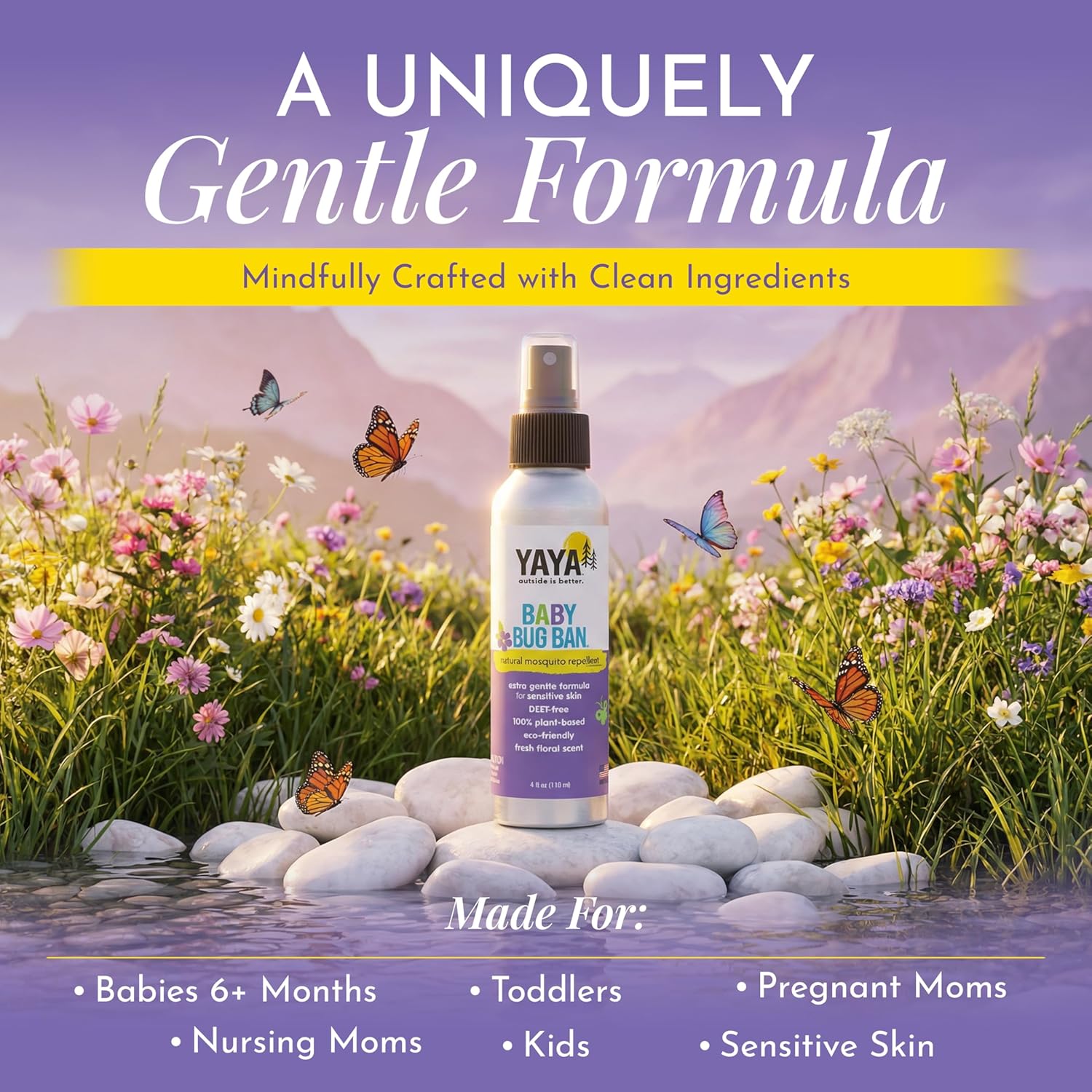 YAYA ORGANICS BABY BUG BAN – NATURAL, GENTLE, FAMILY-SAFE MOSQUITO REPELLENT SPRAY (8 OZ)SAFE, GENTLE PROTECTION FOR LITTLE ONESProtect your baby and toddlers during every outdoor adventure with YAYA Organics natural mosquito repellent spray for infants, , kids, and delicate skin. This gentle mosquito repellent for babies, toddlers, and young children is crafted with 100% plant-based ingredients, including rose geranium essential oil, to provide effective protection without DEET, alcohol, or harsh chemicals. Lightweight and non-greasy, it’s perfect for babies 6+ months, toddlers, kids, pregnant mothers, and nursing mothers, and safe for skin, clothing, strollers, and baby gear.PERFECT FOR OUTDOOR ADVENTURESWhether you’re heading to the park, backyard, or playground,, this outdoor mosquito repellent keeps your little ones bite-free while they play. The ideal mosquito repellent for outdoor fun, camping trips, or family hikes, it works perfectly as a mosquito spray for body, kids mosquito repellent, and baby mosquito repellent, making it one of the most trusted bug spray for kids and kids bug repellent options for sensitive skin.TRAVEL & CAMPING MUST-HAVES FOR FAMILIESCompact and easy to carry, this travel bug spray is perfect for baby camping essentials, camping must-haves, and other camping essentials for kids. Keep your children protected anywhere your adventures take you—be it a weekend getaway, picnic, or family hike—without sacrificing comfort or safety. It’s also a baby safe bug spray and kid safe bug spray, making it gentle enough for daily use.PLANT-BASED, FAMILY-SAFE FORMULAOur formula is vegan, cruelty-free, and made with natural ingredients, making it the perfect plant-based mosquito repellent for sensitive skin and family use. This essential oil bug spray for babies and kids is a gentle formula providing reliable herbal defense against mosquitoes and biting insects while remaining DEET free, and the safest bug repellent for babies. Trust YAYA’s family-safe mosquito repellent for sensitive skin and outdoor use with total peace of mind. FRESH, LIGHTWEIGHT, AND NON-GREASYSay goodbye to heavy, oily, or sticky repellents. This natural mosquito repellent sprays on easily, leaving your skin soft, protected and smelling floral-fresh. This gentle baby mosquito repellent is the ideal insect repellent for kids,—keeping your family comfortable, bite-free and protected during every outdoor activity.FREQUENTLY ASKED QUESTIONSQ1: IS THIS SAFE FOR BABIES AND PREGNANT MOTHERS?A1: Yes! When used as directed, Baby Bug Ban is the perfect baby safe bug spray for babies 6+ months, toddlers, kids, pregnant mothers, and nursing mothers. YAYA’s baby bug repellent is gentle, DEET-free, natural and ideal for delicate skin while providing reliable protection from mosquitoes and biting insects. Rose geranium oil is our hero ingredient, which is soothing on skin and also highly effective for controlling and repelling mosquitos. That being said, we always recommend testing the product on a small patch of skin to see if there is any reaction, and consulting your child’s pediatrician if you see any kind of rash or irritation.Q3: IS IT SAFE FOR CLOTHING, STROLLERS, AND GEAR?A3: Yes. Our plant-based mosquito repellent for sensitive skin and family use, is non-greasy, natural, and can safely be applied to skin, clothing, strollers, and baby gear.Q4: DOES IT WORK AS A BUG SPRAY FOR OLDER KIDS TOO?A4: Definitely. YAYA’s natural kids mosquito repellent provides effective protection for kids of all ages, against mosquitoes and biting insects. Q5: HOW DOES THIS DIFFER FROM OTHER REPELLENTS?A5: Unlike harsh and synthetic products, Baby Bug Ban is a 100% plant-based, all-natural, extra gentle formula made with rose geranium essential oil and plant-based extracts that repel mosquitos naturally and effectively. This essential oil bug spray for babies and kids is DEET-free, and safe for delicate skin, providing peace of mind while outdoors. The light, non-greasy formula smells amazing with a fresh floral scent, and is ideal for spraying on clothing, skin and gear.